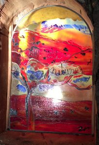 Faire une œuvre originale émettrice de clarté, aux lueurs colorées qui produit de la lumière diffuse, dont l’ombre portée est filtrée par le vitrail scellé au tronc de l’arbre. Une œuvre diffuse comparable à une lampe qui baisse, un…Abat-jour ! Une œuvre différente selon les heures, les saisons, l’angle d’où l’on regarde, une œuvre pour “Faire chanter les fontaines du jour” !