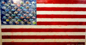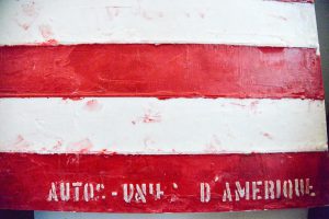 Ici, je souhaite montrer que les États-Unis d’Amérique sont les territoires privilégiés de la consommation à tout va, où la voiture tient une place prépondérante. À l’instar de Jasper Johns qui se servait des éléments de la culture populaire américaine dans ses oeuvres, j’ai créé un drapeau américain dont chaque état est représenté par un type de voiture américaine (Ford, Cadillac, Chevrolet, Dodge, Buick…).