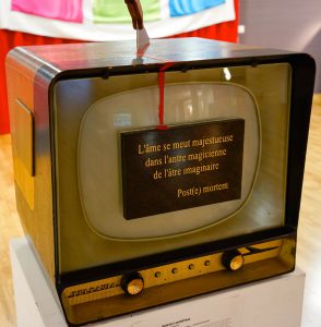 Œuvre et support de l’oeuvre, ici l’âme (lame) se meut majestueuse dans l’antre magicienne de l’âtre imaginé… Et tous, face à la céleste image que renvoie l’écran blessé du téléviseur, de crier à l’univers dans un chant singulier : “Tout art est à la fois surface et symbole…”.