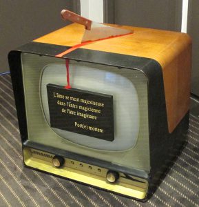 Un vieux poste de télévision ; sur l’écran, un poignard rouge sanguinolent est enfoncé… Des graffitis sont inscrits sur les parois du téléviseur, qui parlent de poésie, de reflets, de l’image, de la représentation, de la trahison des images, du virtuel et de la réalité, de l’immédiat et du différé, du récurrent et du ponctuel, des icônes, des idées, des idoles et des idylles…